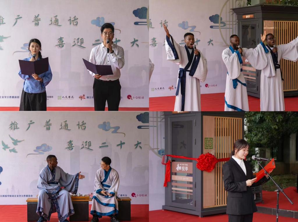启动仪式上,一院一景“全民阅读”朗读亭——和悦亭正式投入使用;推普大使向全校师生宣读推普倡议书;校大学生文化素质教育基地读书频道“小Q悦读”主播献诵《青春中国》;第十届大学生中华经典诵读竞赛留学生组一等奖获奖作品《读中国》《赤壁赋》等作品在现场展演。