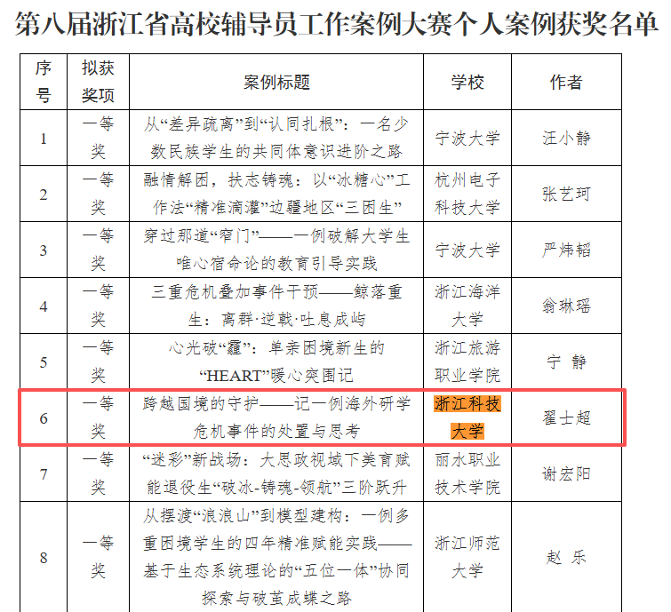 喜报丨我院翟士超老师荣获第八届浙江省高校辅导员工作案例大赛一等奖