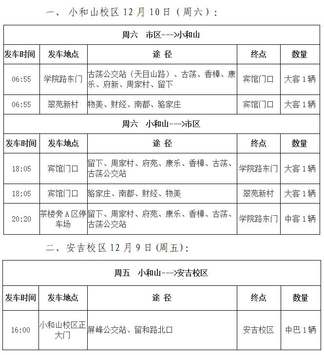 应教务处2022年下半年全国大学英语等级考试安排的要求, 2022年12月9日(周五安吉)、12月10日(周六小和山)学校教职工班车安排调整如下: