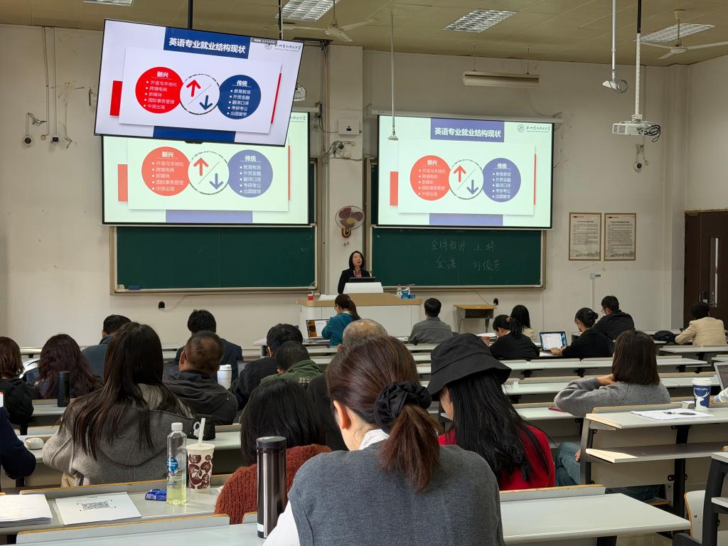 活动中,任利老师指出,随着生成式AI技术的快速发展,外语教育正面临深刻变革。她强调,人才培养应坚持以人为本,在尊重学生主体性的基础上,积极探索人机协同的教学新路径。任老师结合具体课程的教学实践,系统讲解了如何将人工智能素养有机融入课堂设计、互动组织与作业布置等关键教学环节,从而实现课程要素与教学流程的全方位创新。