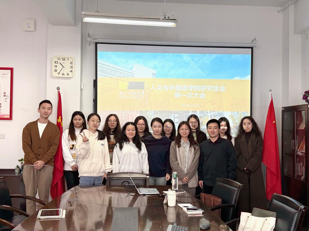 2025年11月4日,浙江科技大学人文与外国语学院第一届研究生会第一次大会在A3-306召开。本次大会聚焦学院研究生会团队建设与工作规划,学院党委副书记王铁军、研会指导老师翟士超及全体研会成员出席本次会议。