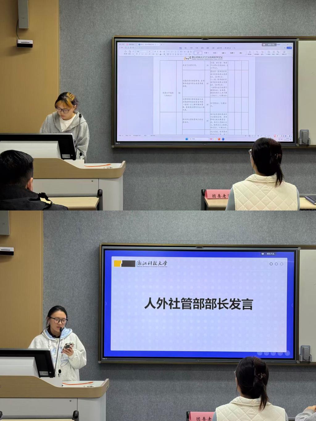 随后,我院社团管理负责人朱可莹对《浙江科技大学学生社团星级评定细则》进行系统解读,强调规范是社团发展的基石,活动质量与宣传效果是提升影响力的关键,各社团要充分认识星级评定的重要导向作用,以此为契机,不断加强自身建设,提升发展内涵。社团管理部门部长杨希月围绕社团活动与宣传材料审批流程、材料提交规范等内容进行详细说明。她在发言中指出,学生社团是校园文化建设的重要载体,是落实立德树人根本任务的有效平台,做好社团管理工作责任重大、使命光荣。希望各社团负责人进一步增强责任意识,认真履行职责,共同推动我院社团工作再上新台阶。