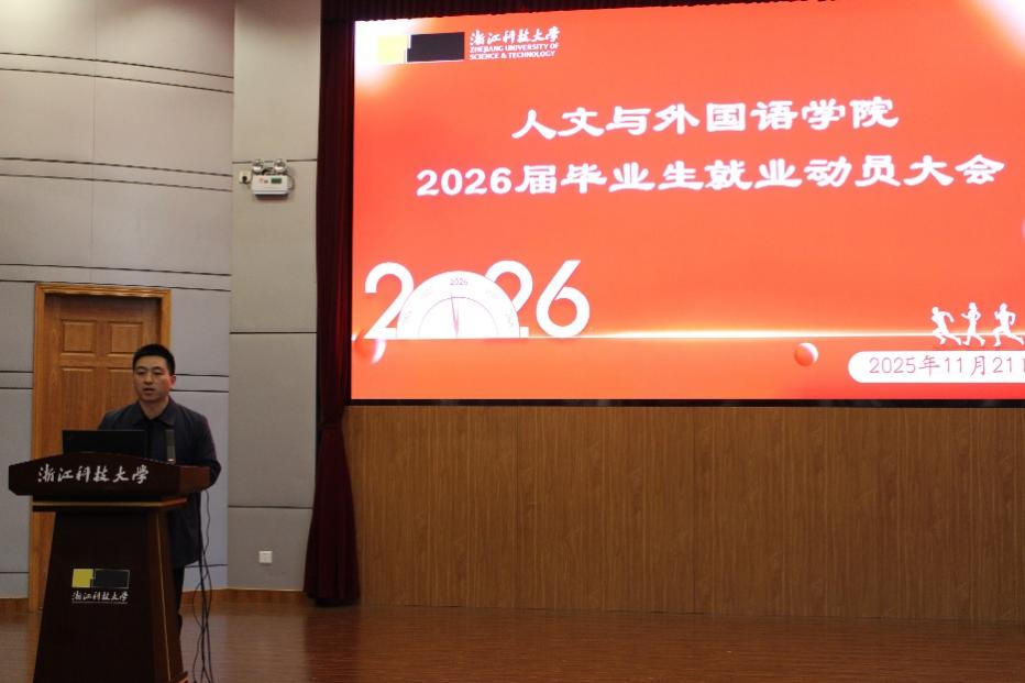 为助力2026届毕业生顺利开启职业生涯新篇章,11月21日,人文与外国语学院在图西报告厅举行了毕业生就业动员大会,学院执行院长樊燕龙、党委书记邵莉敏、外语系系主任祝敏及2026届班主任、辅导员和全体2026届毕业生齐聚一堂,学院邀请了杭州市就业管理服务中心青年就业处处长赵逸斌、杭州市大学生创业导师俞广良进行就业指导。会议由学院党委副书记王铁军主持。