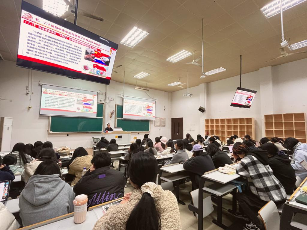 随后,王铁军以《深学笃行党的二十届四中全会精神,勇担 “十五五” 现代化新使命》为题,开启本次党课第一讲。他紧扣党的二十届四中全会精神,全面讲解了党的二十届四中全会的重要意义,深入阐释了“十四五”规划时期我国各领域取得的历史性成就,系统解读了“十五五”规划的内在逻辑和战略布局,并结合主流媒体的权威报道阐述了规划的时代背景、重点任务和深远意义。最后他引导同学们深刻把握全会擘画的未来发展蓝图,重点阐述了规划所确立的指导思想、六大遵循原则以及七大主要目标,揭示规划既立足当下现实需求、又锚定2035远景目标的战略纵深感。他详细剖析了科技自立自强、全面推进乡村振兴、构建现代化产业体系等十二项关键战略任务的内在联系与实践路径;他激励大家深刻领会精神实质,增强使命担当,将学习成果转化为实际行动,为全面建设社会主义现代化国家贡献青春力量。