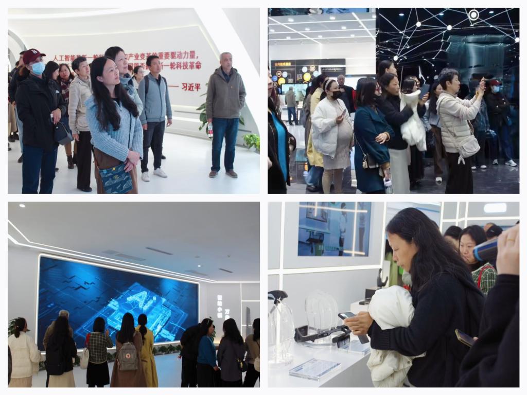首先参观的是中国(杭州)人工智能小镇。一踏入展厅,充满现代感的蓝白配色空间与科技化的数字大屏便映入眼帘,令人仿佛置身于未来世界。在讲解员的介绍下,党员教师们深入了解了杭州市人工智能产业的发展概况,以及人工智能小镇的战略定位、建设规划和重要使命。展厅集中呈现了人工智能在快递物流、健康医疗、芯片科技、低空经济、环境生态等多个领域的实际应用成果,生动展现了AI技术赋能社会生活的广阔前景。