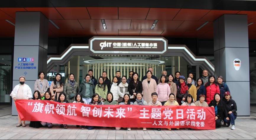 习近平总书记强调:要“推进人工智能全学段教育和全社会通识教育,源源不断培养高素质人才。”为深入贯彻习近平总书记的重要讲话精神,学习贯彻党的二十届四中全会精神,11月27日,人文与外语学院党委组织教师党员46人赴中国(杭州)人工智能科技小镇和海创园进行参观学习,开展主题党日活动暨理论学习中心组实践学习活动