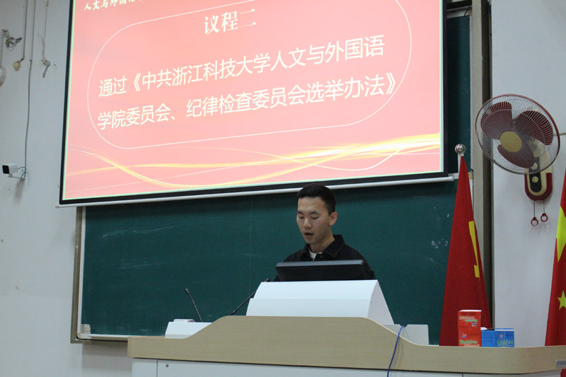大会表决通过了《中共浙江科技大学人文与外国语学院委员会、纪律检查委员会选举办法》和大会总监票人、监计票人名单以及“两委”委员候选人名单